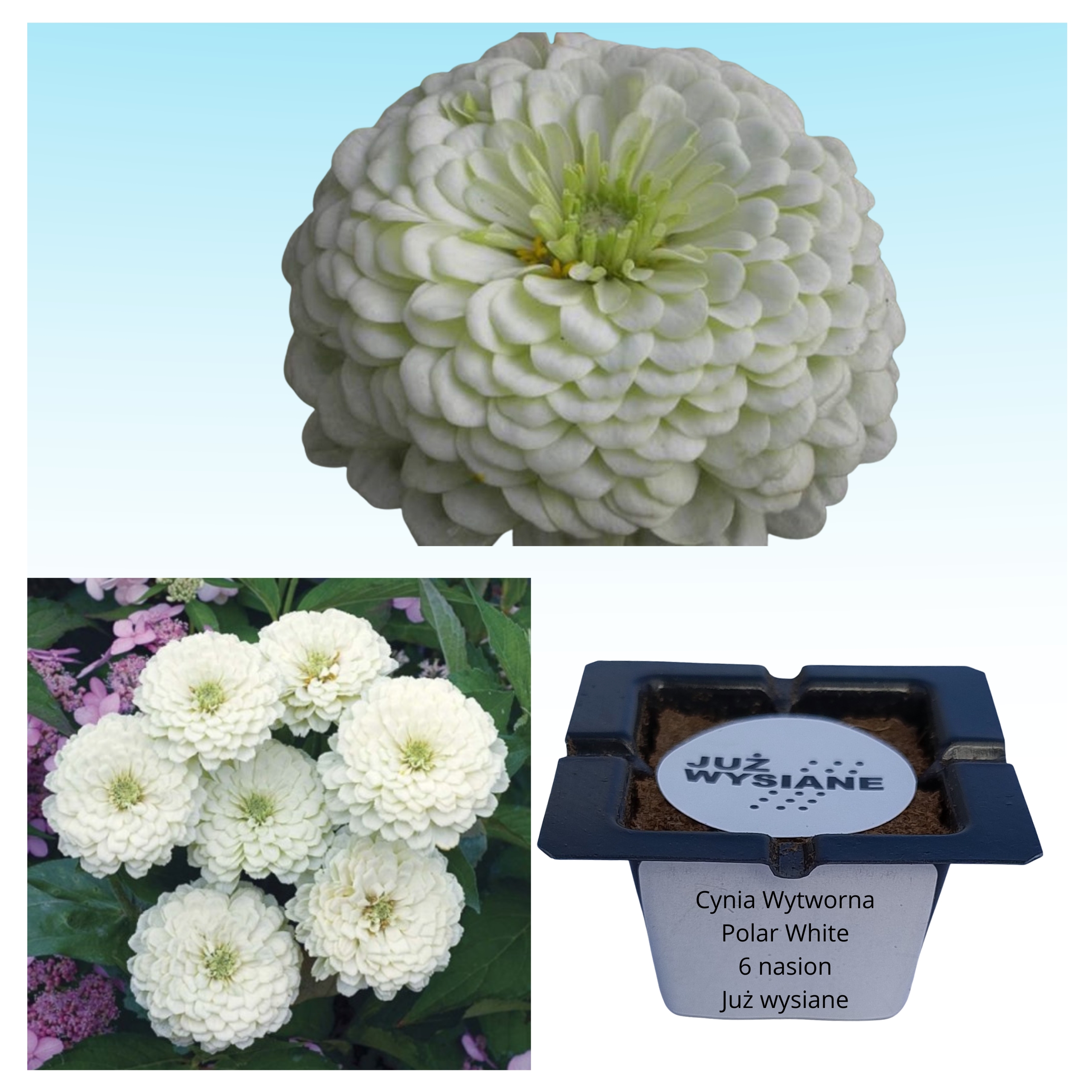 Cynia Polar White to jednoroczna roślina ozdobna, dorastająca do 70–90 cm wysokości. Tworzy duże, pełne, białe kwiaty, które utrzymują dekoracyjny efekt przez całe lato i jesień. Roślina ma proste, wyprostowane pędy, które świetnie komponują się w rabatach, na obwódkach i w pojemnikach.